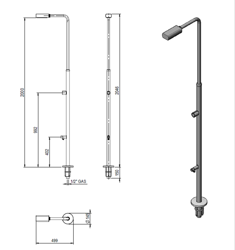 duș realizat din oțel inoxidabil AISI-304 lustruit (diametru 43 mm).
