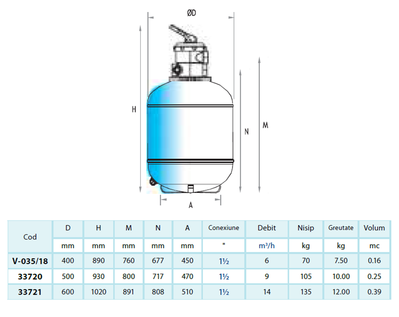 Conexiuni 11/2”. Presiune de lucru - 2 bari, testat la 3,5 bari.