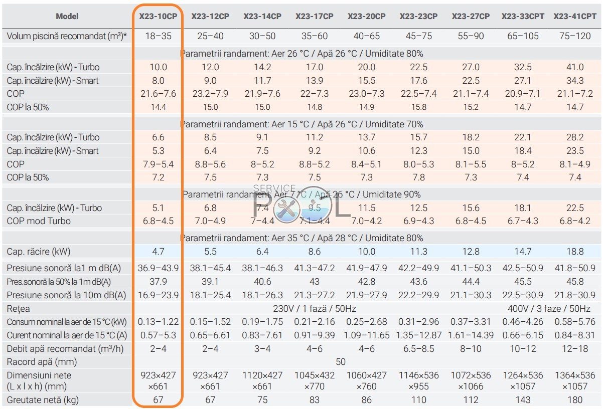 Specificatii tehnice detaliate pentru gama de pompe de caldura pentru piscina Fairland INVER X23.
