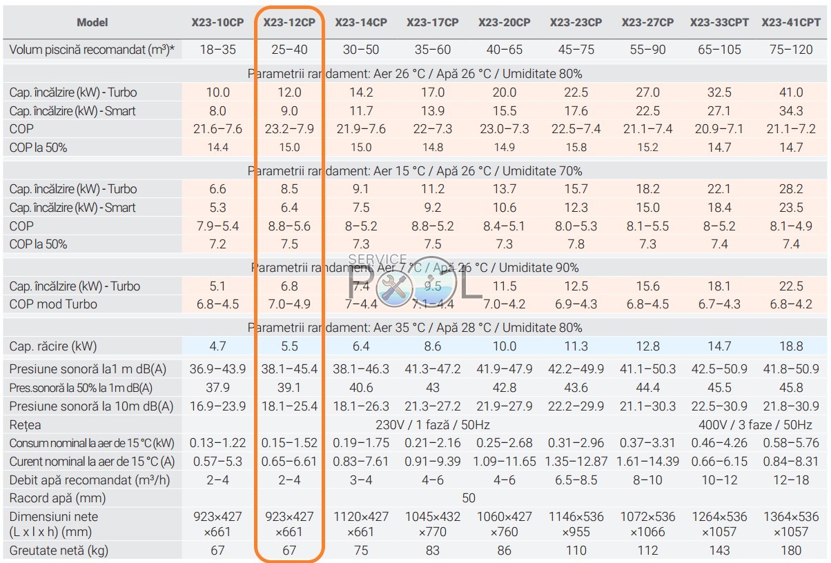 Specificatii tehnice detaliate pentru gama de pompe de caldura pentru piscina Fairland INVER X23.