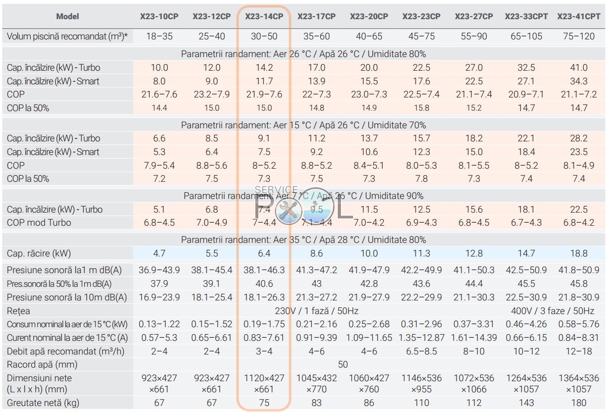 Specificatii tehnice detaliate pentru gama de pompe de caldura pentru piscina Fairland INVER X23.
