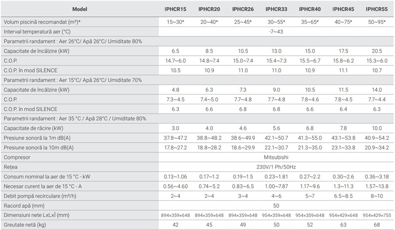 (P=13.5kW la Aer: 26°C / Apă: 26°C / Umiditate 80%)