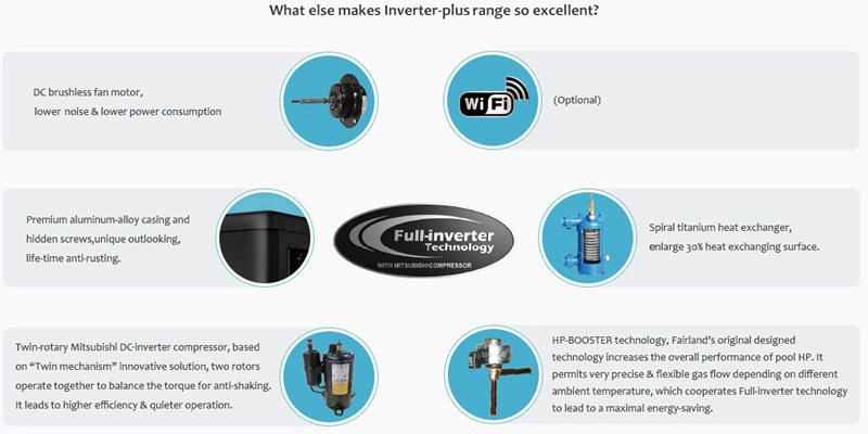 Compresorul Mitsubishi, folosit de către pompa de caldura Inverter-plus, și sistemul Full-inverter asigură un mediu de 10 ori mai silențios în timpul menținerii temperaturii apei.