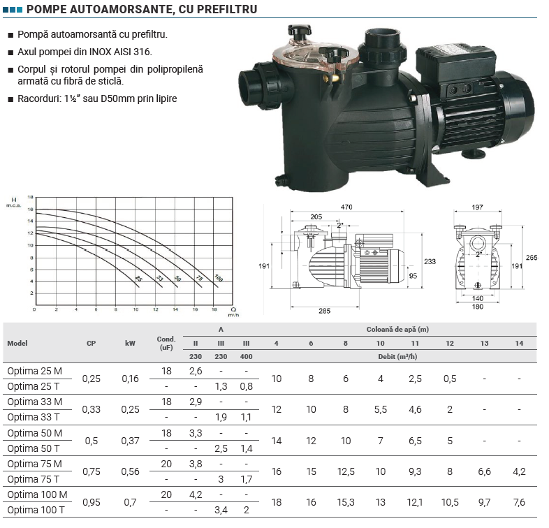 Pompa cu amorsare automată pentru piscine, cu prefiltru mare, care, împreună cu performanțele sale hidraulice excelente, generează o capacitate de filtrare foarte mare.