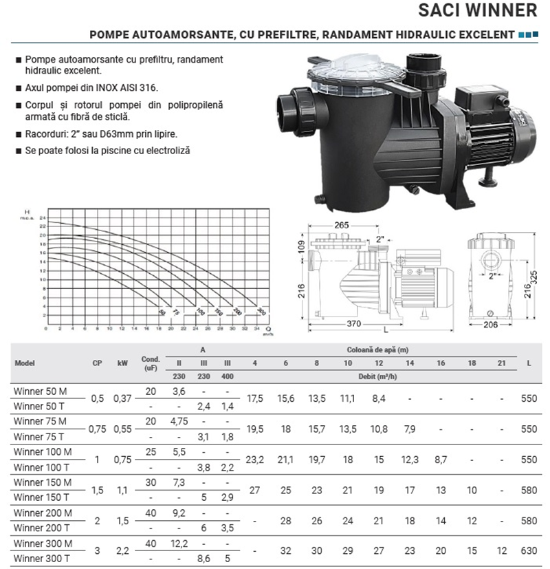 Pompa WINNER de la SACI Pumps, autoamorsanta, pentru piscine private, design placut si robust, cu prefiltru mare, usor de intrebuintat.