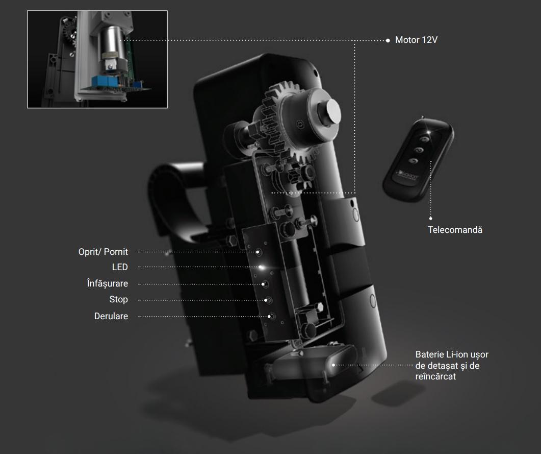 Mecanismul de derulare actionat printr-o simpla apasare de buton pe telecomanda dedicata.