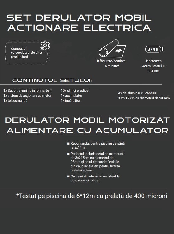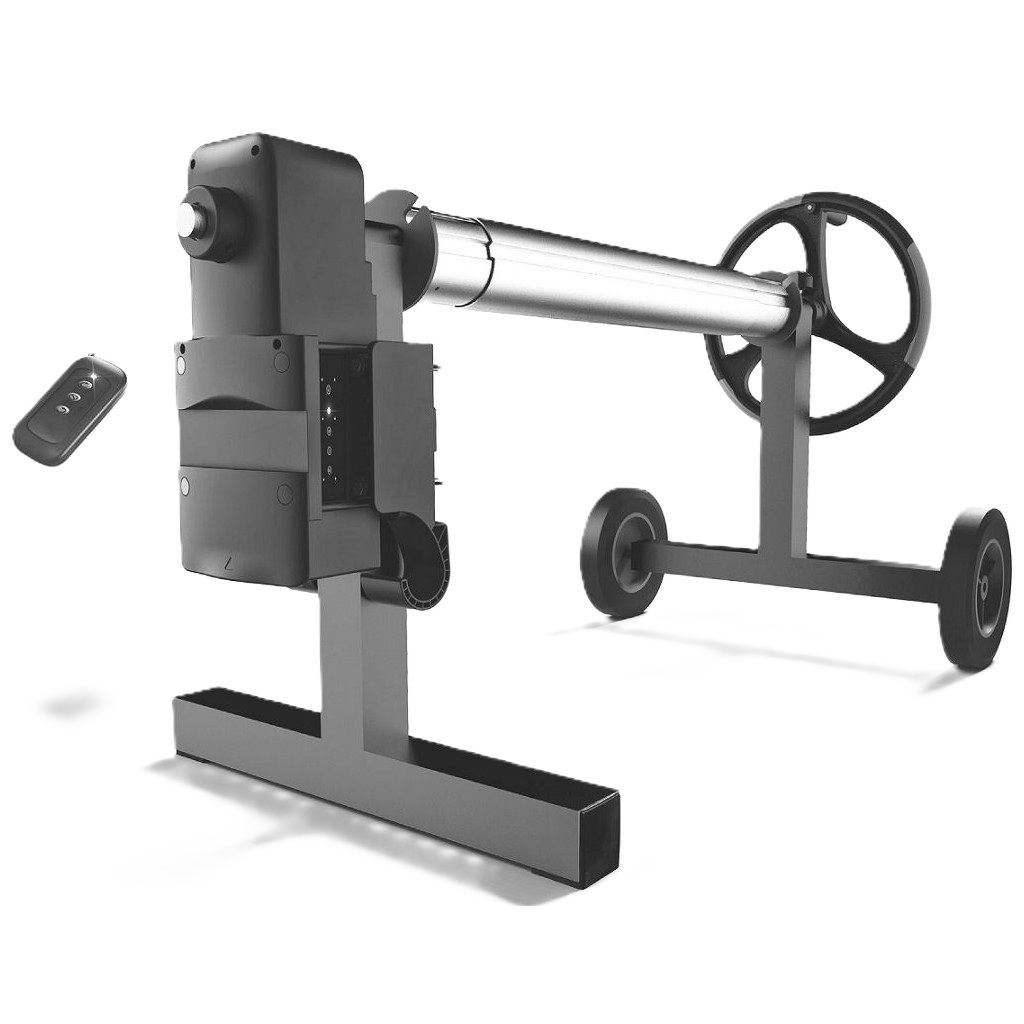 Derulator pentru prelata cu acționare electrică pentru instalarea și îndepărtarea ușoară și rapidă a prelatei de vară pentru piscină.