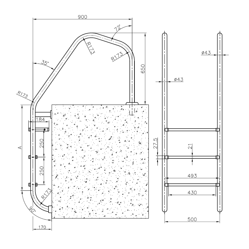 overflow cu manere si trepte pentru piscine cu canal perimetral si structura de